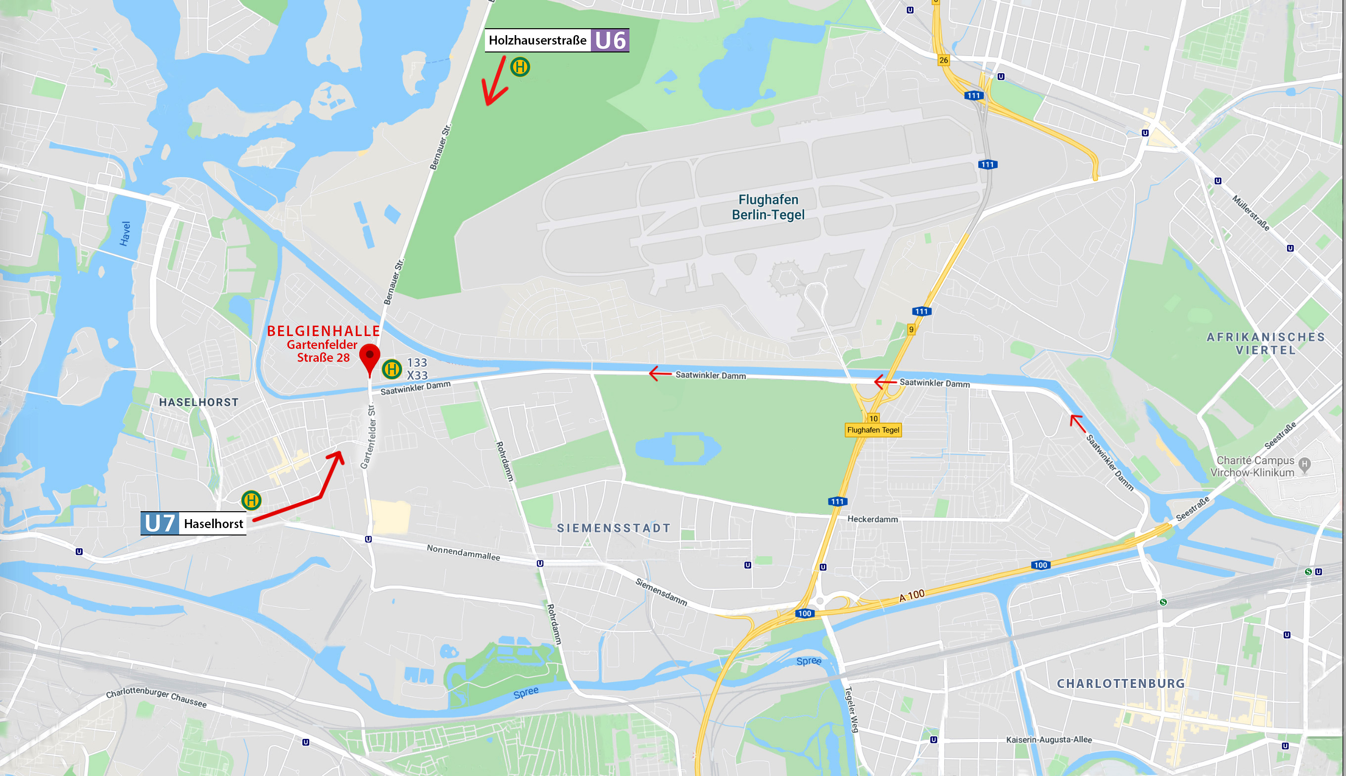 Mit dem Auto erreichen Sie die Belgienhalle am einfachsten über die Berliner Stadtautobahn 111 (Ausfahrt Flughafen Tegel).