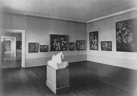 Now and again, Justi showed sculpture in the artists' galleries, for instance Wilhelm Lehmbruck alongside Marc, Rudolf Belling alongside Feininger, and Philipp Harth alongside Ernst Ludwig Kirchner. In this "experimental gallery," rooms less frequently showed the work of artists' groups and trends from Expressionism to Neue Sachlichkeit.