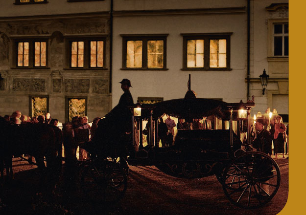 | První část divadelní cesty vrcholí ve velkém pohřebním průvodu s pochodněmi, pompes funebres a smutečním pochodem z Mahlerovy 5. symfonie, za jejichž tónů je Mahlerova rakev nesena ke hřbitovu. Publikum poté obdrží pozvání na smuteční hostinu s jídly, která byla přivezena ze všech měst, jimiž hra Alma v posledních deseti letech cestovala: Vídeň, Benátky, Lisabon, Los Angeles (menu je zahrnuto v ceně vstupenek). Praha je město, do kterého se Gustav Mahler v průběhu svého života často vracel. Jako mladý muž zde během svých jihlavských studií v letech 1871–1872 strávil několik nešťastných měsíců, v letech 1885–1886 tady však už požíval uznání, které mu bylo jako umělci prokazováno. V Praze byl ve svých 25 letech činný jako operní dirigent v Deutsches Theater (Stavovské divadlo). Dne 19. září 1908 zde byla pod jeho vedením uvedena premiéra jeho 7. symfonie. Dodnes se dochovaly domy, které navštívil nebo v nichž bydlel. |