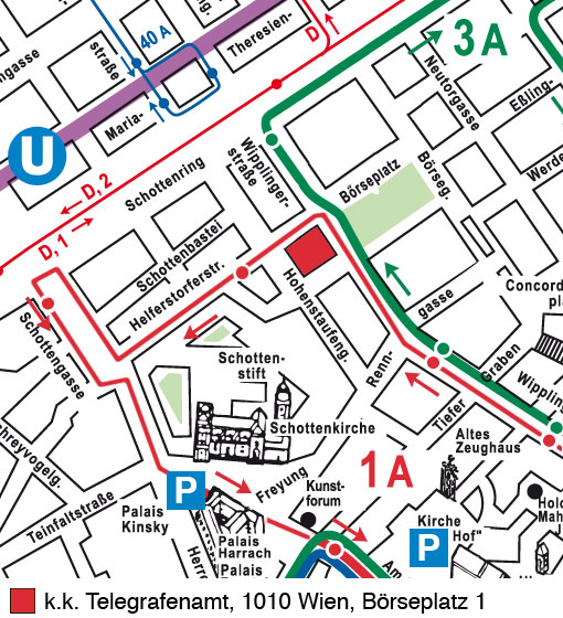 Spielort 2008 - 2013 k.k. Post- und Telegrafenamt, 1010 Wien, Börseplatz 1 (Eingang Hohenstaufengasse 8) Das Telegrafenamt liegt an der Wipplingerstraße Parkmöglichkeiten in unmittelbarer Umgebung oder in den Garagen Am Hof und auf der Freyung. ›› Wegbeschreibung (How to find us) Das ehemalige k.k. Post- und Telegrafenamt wurde 1870-1873 als historistisches Palais für die 1849 gegründete Telegraphen-Zentralstation gebaut. 1902-05 wurde der Bau erweitert, wobei das oberste Geschoss erhöht und repräsentativ ausgebaut wurde. Die Fassade trägt die Aufschrift "k.k. Telegraphen-Anstalt" und als Krönung des Vordertraktes thront eine mächtige, die Telegraphie symbolisierende Figurengruppe, die auf einem Globus sitzt. Der Festsaal im 4. Stock trägt eine Spiegelrahmendecke und Säulen, die von den Häuptern von Sol und Chronos gekrönt sind. Das Gebäude beherbergte eine Versuchsstation für drahtlose Überland-Telegraphie und Telephonie. Das Vestibül bildet eine 3-schiffige, ionische Säulenhalle mit Wandgliederung, Arkaden und Stuckdecken. Im Parterre beherbergte der ehemalige Kassensaal mit Stuckdecken und korinthischen Säulen und Pilastern zuletzt noch ein Postamt. Im Hauptstiegenhaus erschließt eine monumentale Vierpfeilertreppe einen offenen Schacht mit toskanischen, kannelierten Säulen. Die ehemaligen Apparatsäle im vierten Stock haben bereits eine sezessionistische Stuckgliederung, der Hauptsaal eine Spiegelrahmendecke und repräsentative Säulen mit Masken, die von den Häuptern von Sol und Chronos gekrönt sind. Die grossen Bogenfenster führten den dort untergebrachten Apparatsälen in reichlichem Maße Licht zu. Das Gebäude beherbergte unter anderem eine Versuchsstation für drahtlose Überland-Telegraphie und Telephonie. Andere Räume wurden für die Führung der Rohrpostleitungen zu den darüber angeordneten Stationsapparaten und der zu den Reservoirstationen abgehenden Luftleitungsrohre benützt. Im Trakt gegen die Rockhgasse waren die Diensträume der Depeschenausträger untergebracht und mit dem darüber liegenden Zentralexpedite durch eine pneumatische Rohrleitung und ein Fallrohr verbunden. Vom Vestibül gelangte man in den Telegrammaufgaberaum, der durch eine Schalterwand von der Telegrammannahme, der Kassa und der Reklamation getrennt war. Dahinter befand sich der Amtsraum für die telephonische Telegrammvermittlung, das Zentralexpedit und die Rohrpostzentralstation. Im Zentralexpedit war eine Station der zwischen diesem und den Apparatsälen verkehrenden Depeschenseilbahn untergebracht und die Station der Hausrohrpost, die die Depeschenseilbahn zur Nachtzeit zu ersetzen hatte. Rechts vom Vestibül befand sich der Warteraum für das telephonierende Publikum, von dem ein Zugang in den Sprechzellen- und Umschaltraum führte; dieser Raum war durch eine Balustrade in zwei Teile geteilt, von denen eine für das diensthabende Personal bestimmt war, während der andere 5 Sprechzellen enthielt. Der Umschaltraum war durch Schalter sowohl mit dem Parteienraum als auch mit jenen Lokalitäten verbunden, die ausschließlich für Journalisten bestimmt waren und auch besondere Sprechzellen für diese enthielten. Im Parterre war zusätzlich das Postamt Wien 6 untergebracht. Das dritte Stockwerk enthielt den Hauptrangierraum, in dem die Adern der Telegraphen- und Akkumulatorenkabel an die Hauptumschaltapparate angeschlossen waren, um von dort weiter in die Apparatsäle geführt zu werden, die Linienrelais und die Translationseinrichtungen. Weiters waren im dritten Stockwerk die Schlafräume, in denen das Nachtdienstpersonal der Ruhe pflegen konnte. Das oberste, vierte Stockwerk wurde vollständig von den vier großen 7,3 Meter hohen Apparatsälen eingenommen, die insgesamt eine Bodenfläche von 1600 Quadratmetern besitzen und von denen der größte eine Breite von 13 Metern und eine Länge von 40 Metern aufweist. Um diesen Räumen, in welchen Tag und Nacht Hunderte von Personen angestrengt arbeiten mussten, möglichst frische und reine Luft zuzuführen, wurde in der Gartenanlage am Börseplatze ein Frischluftpavillon errichtet, von dem die Frischluft durch einen unterirdischen 32 Meter langen Hauptfrischluftkanal zu den im Keller befindlichen Luftreinigungs- und Befeuchtungsvorrichtungen gelangte. Hier passierte die Außenluft zunächst Filter aus Segeltuch und einen Wasserzerstäubungsapparat und gelangte sodann durch Frischluftkanäle zu den Heizkammern, um von hier aus den zu ventilierenden Räumen Zentralexpedit, Postamt, Akkumulatorenraum und Apparatsäle, Büffet und Dachboden zugeführt zu werden; im Winter wurde die Luft nicht nur erwärmt, sondern auch befeuchtet und es gestatteten die Lufterwärmungsvorrichtungen bei + 5° Außentemperatur einen 1,5- bis 2maligen Raumluftwechsel pro Stunde. Was den Dachstuhl des Gebäudes anbelangt, ist anzuführen, daß das alte Gebäude bereits einen eisernen Dachstuhl trug, welcher zu den ersten von der Firma Ignaz Gridl in Wien aus belgischem Schmiedeeisen errichteten Dachstühlen zählte. Für die Beleuchtung des Telegrafenamts war die Installation von 1258 Glühlampen und von 66 Bogenlampen erforderlich. Die Wahl der Beleuchtungsart der Bogenlampen erfolgte auf Grund eingehender Beleuchtungsproben, die den Zweck hatten, eine den Anforderungen des Betriebes entsprechende Beleuchtung der Arbeitsplätze jedes Saales bei möglichst geringem Strombedarf ausfindig zu machen. Die unverhältnismäßig hohen Kosten, welche die Anwendung von Glühlampen für die Saalbeleuchtung erfordert hätte, gaben schließlich den Anlass zu einer originellen Lösung der Beleuchtungsfrage, welche sowohl in ihrer Wirkung als auch in ökonomischer Hinsicht vollkommen einwandfrei war. |